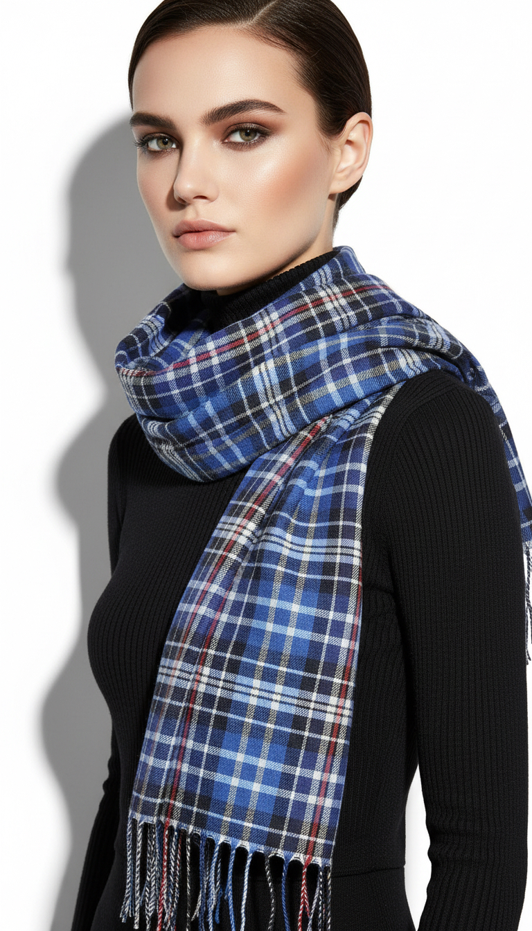 Lightweight, soft Maisonnoée scarf made from premium viscose. The classic blue, white, and black check pattern gives any outfit a refined, modern touch. Comfortable, versatile, and ideal for everyday wear and transitional seasons.