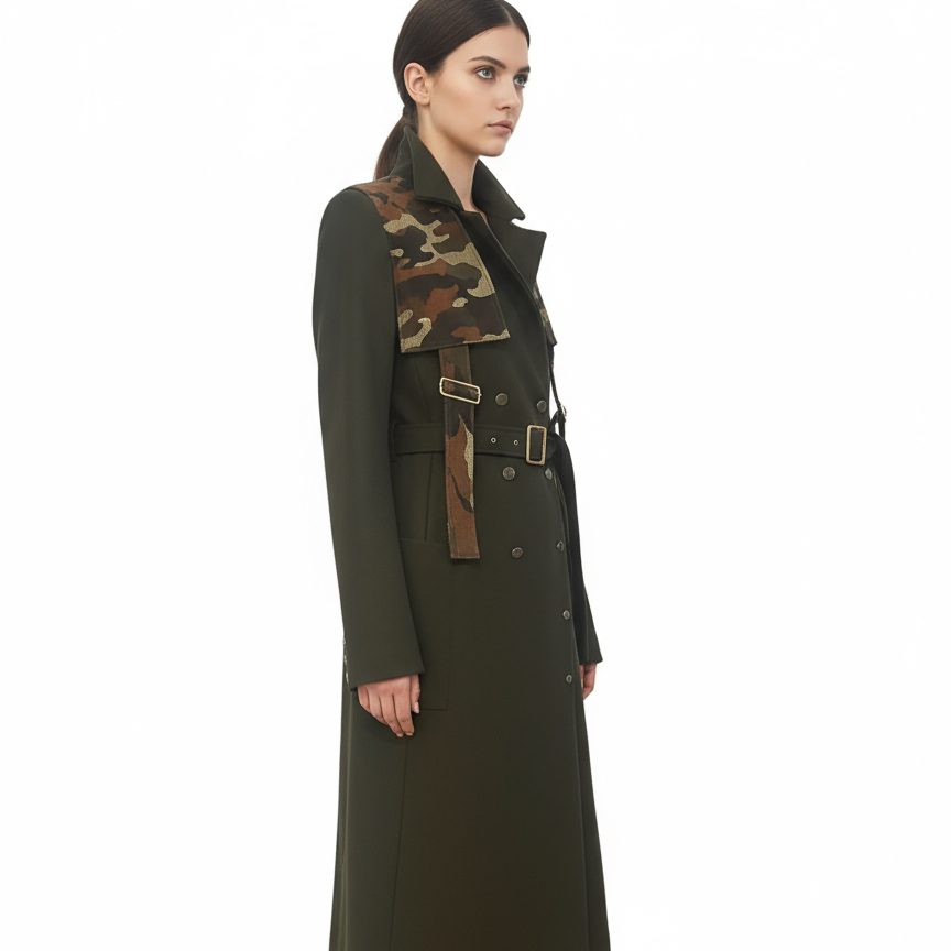This green wool coat from Maisonnoèe is a noble and unique piece of clothing that impresses with its high-quality details and elegant design. Its unique feature lies in the removable shoulder yoke made of embroidered leather in camouflage optics, decorated with exquisite gold buckles that can be adjusted to your outfit at any time.